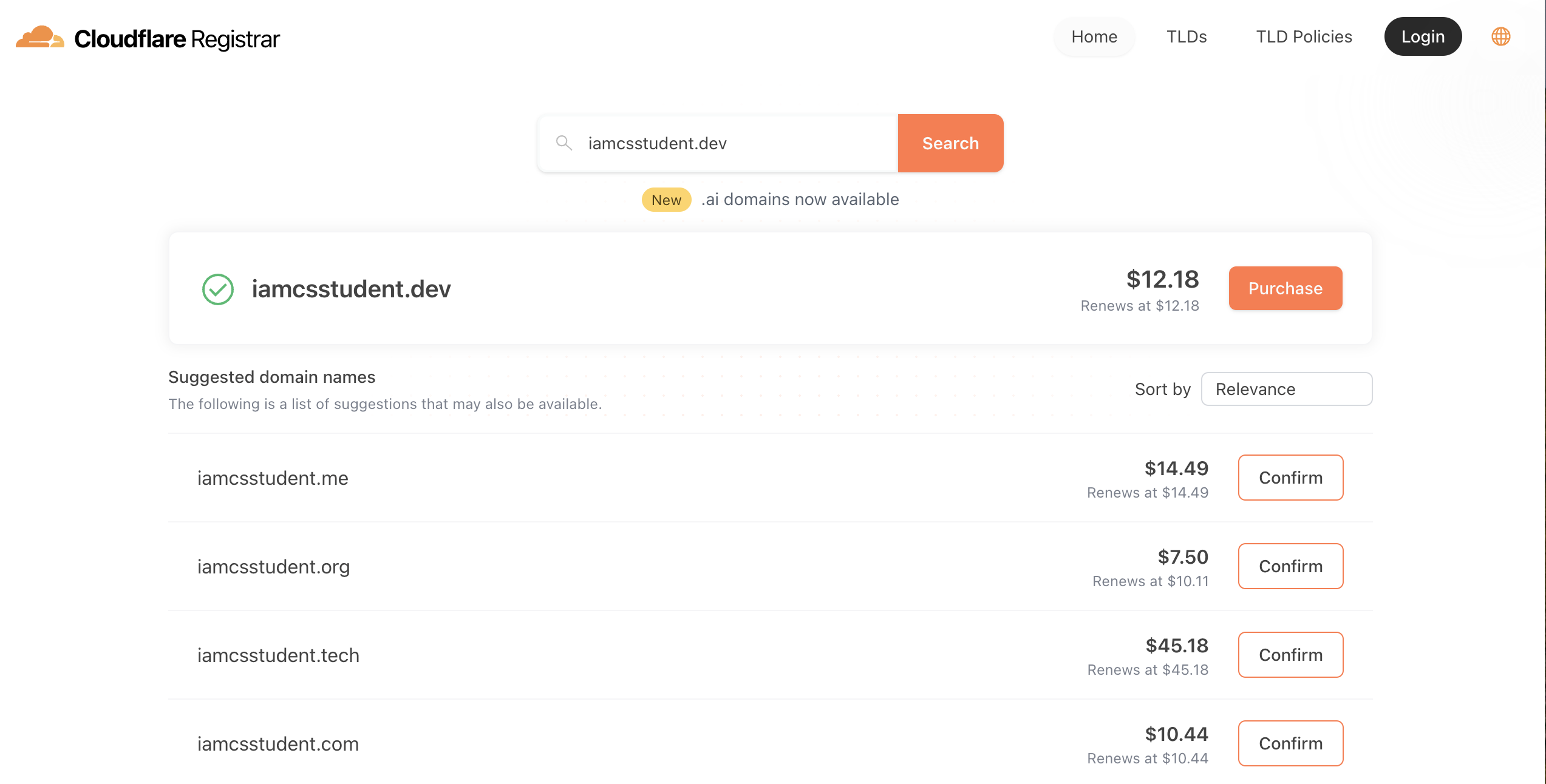 例として「iamcsstudent.dev」と検索すると2025/05/01時点では年間 $12.18 で利用できます。現在のレートだと日本円で 1,746 円です。1ヶ月あたりで考えると 145 円なのでそこまで高くない気がしてきます。